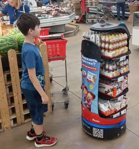 Покупатели устали от однотипной рекламы. А вот робот с экраном, движущийся между стеллажами и включающий видео — вызывает живой интерес. Он становится центром внимания: